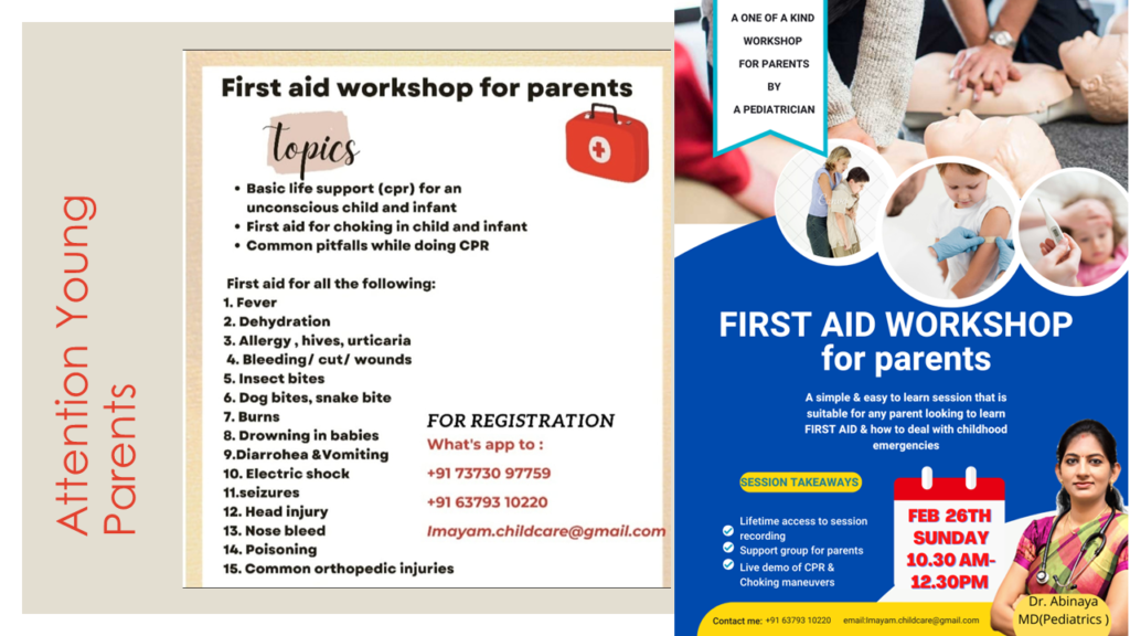 To book your spot for the online first aid session, please mail me to Imayam.childcare@gmail.com or send a message through WhatsApp to +91 63793 10220. If you have any questions, please do not hesitate to contact us.